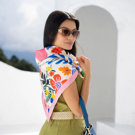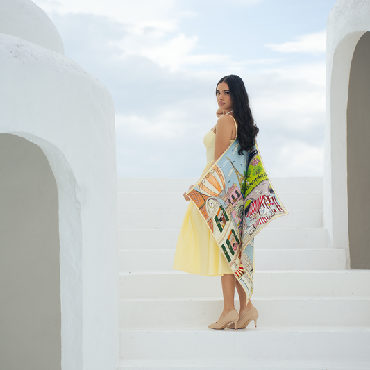Wander through the heart of Paris with this whimsical silk scarf (100% silk), where the Eiffel Tower, charming cafés, and cobblestone bridges come alive in a vibrant tapestry of color and charm. Each detail celebrates the city’s timeless romance and artistic spirit, making it perfect as a neck scarf, headscarf, top, or belt.