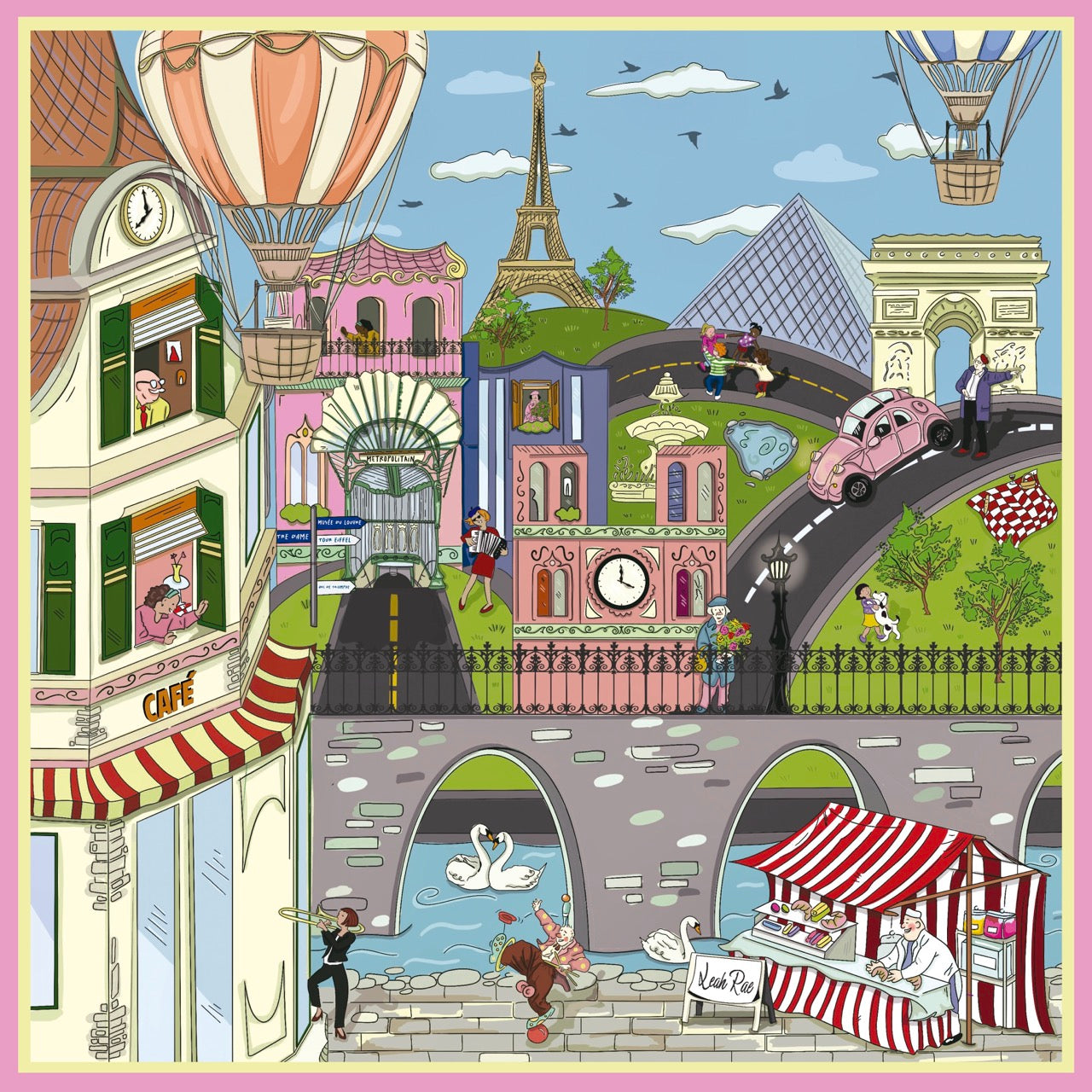 Wander through the heart of Paris with this whimsical silk scarf (100% silk), where the Eiffel Tower, charming cafés, and cobblestone bridges come alive in a vibrant tapestry of color and charm. Each detail celebrates the city’s timeless romance and artistic spirit, making it perfect as a neck scarf, headscarf, top, or belt.